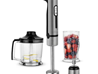 Has: Turbo function Contains: 700 ml clear glass, acetyl mixer, chopper, potato masher and holder base.